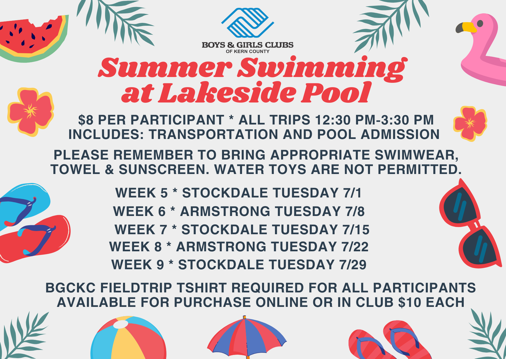 The Boys & Girls Clubs of Kern County is is accepting Field Trip Enrollments for Summer Day Camp Registrants. Members that attend a Day Camp week may enroll in our Field Trips online. Field Trips will be offered at the following locations for Summer Day Camp Members: E.L. Jack and Monica Armstrong Youth Center, Stockdale Kid's Club, and the Suburu Club.